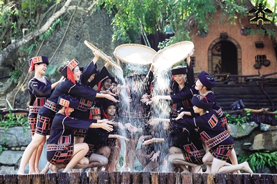 在景区里表演的黎族传统舞蹈舂米舞。(资料图片)