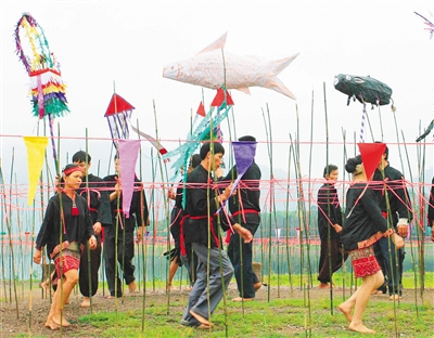 在水库边上一块约有一千多平方米的荒草地上,便是跳老古舞的场地,上面插着上千条竹子,乍看杂乱无章,仔细观察却能发现每根竹子间都以草绳相连,一根根细竹间,留出了一条条小径。