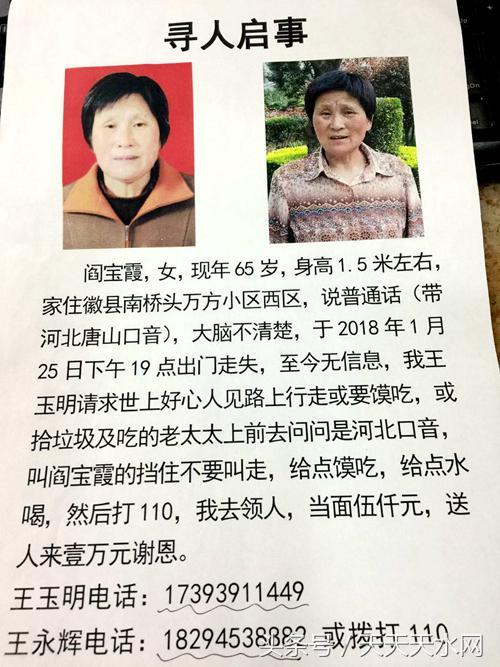 王玉明的老伴,名叫阎宝霞,今年65岁,于1月25日晚上7点从家中出门后走失。已经两个多月,至今还没有找到。