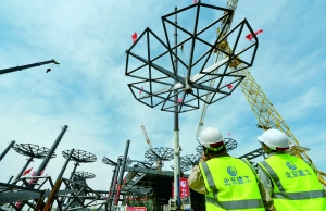 “花伞”由钢柱和悬挑钢梁构成,在顶部花瓣处相互连接。目前,18朵“花伞”已吊装完成。