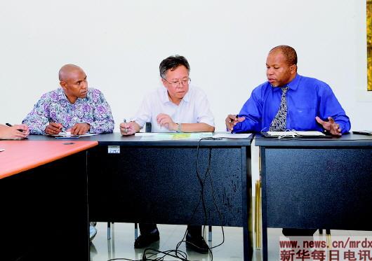 4月18日,广州中医药大学教授宋健平(中)与当地抗疟项目工作人员开会讨论下一步抗疟工作安排。 新华社记者吕帅摄