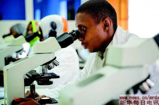 4月17日,在科摩罗大科摩罗岛,一名当地科研人员检查当地居民血液样本。 新华社记者吕帅摄