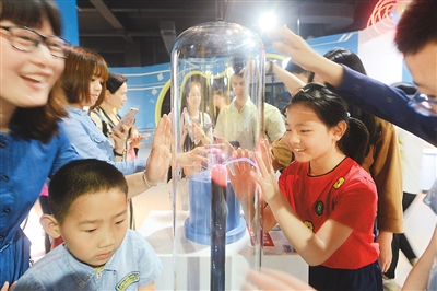 5月1日,江苏省扬州市科技馆里前来参观的孩子络绎不绝。孩子们通过动手实验体验科学现象,学习科普知识,享受“科普大餐”,零距离感受科技魅力,度过快乐的假期。图为小朋友在科技馆体验“辉光球”。