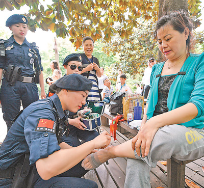 5月1日,浙江杭州西湖女子巡逻队队员正在为受伤游客作紧急处理。据了解,该巡逻队成立两年来,共劝导不文明行为14100余起,服务游客18500余次,成为西湖景区一道新的风景线。