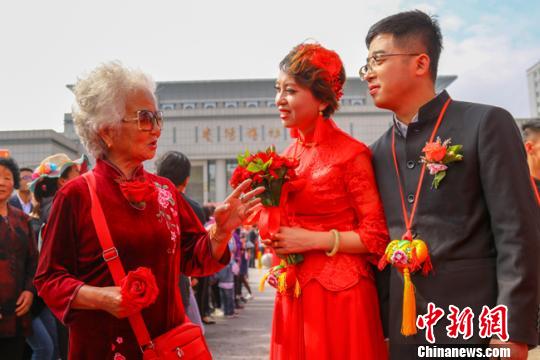 图为新人接受白发老人的祝福。 陈飞 摄