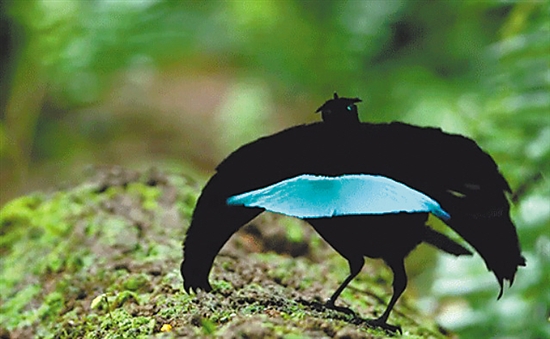 美国康乃尔鸟类学实验室公布的一组丽色掩鼻天堂鸟求偶视频,黑色的雄鸟突然“开屏”的一幕令人惊艳,胸部还竖起了一圈“蓝色天鹅舞裙”。研究人员称,这种小鸟因其独特的求偶行为已被确认为一个单独的物种。