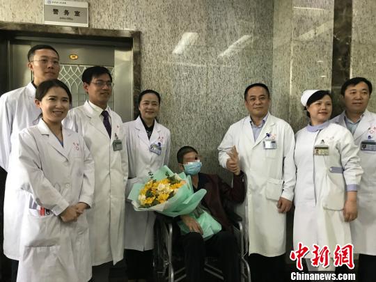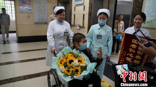 患者出院,医院护士为其送花。 周燕玲 摄