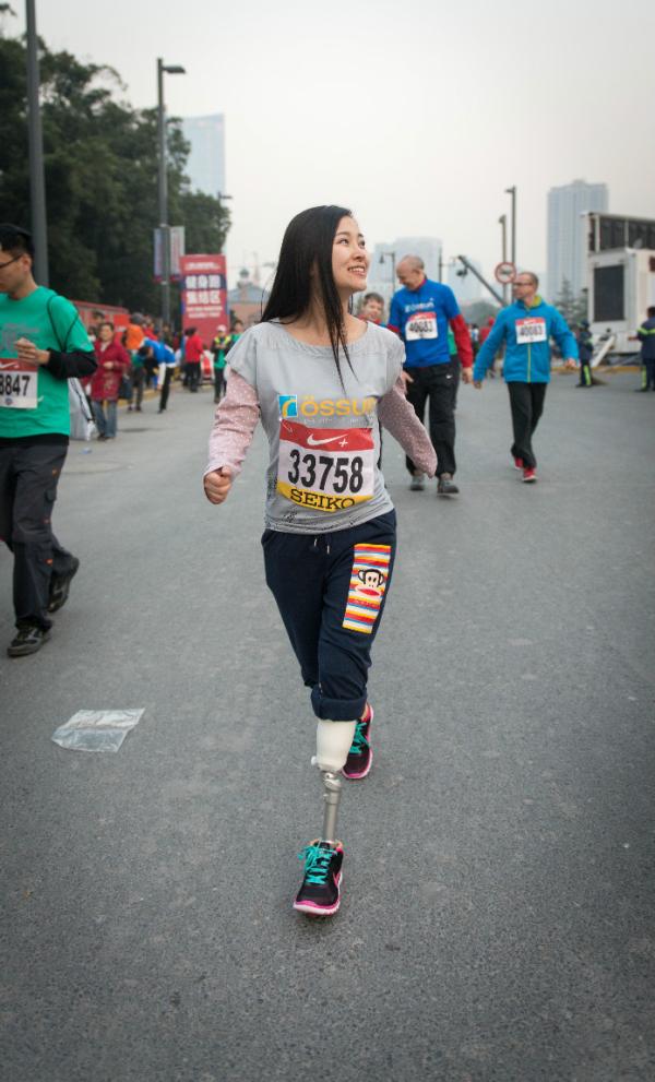 所以这也是为什么那一年马拉松,我穿着假肢,没有包装的假肢去跑;这也是为什么我跟老公约会,我都会特别换一个假肢,钢管假肢,穿短裙,走出去;这也是为什么在婚礼上,我老公设置了为我穿假肢的环节,就是希望大家能够看到我本来的样子,我接受自己的样子。