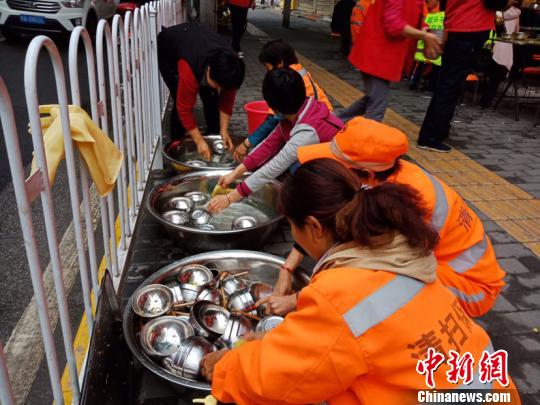 图为就餐者主动帮忙收拾桌椅、清洗碗筷。 史雪枫 摄