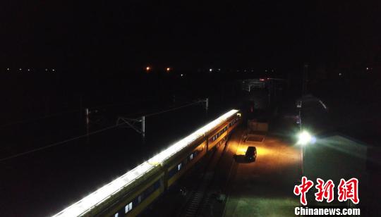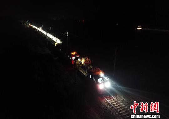 5月9日凌晨,一列长210米的综合检修列正在驶出南昌供电段共青城际接触网工区。 丁波 摄