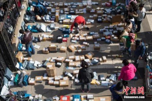 资料图:快递工作人员忙着分拣满地的快递。武俊杰 摄