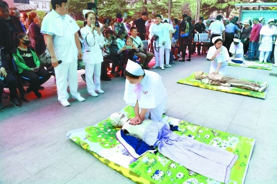 今天上午,在该医院院前急救演示现场,医护工作者们为百姓详细讲解了心肺复苏的急救知识,演示了心肺复苏术的操作方法,并鼓励群众进行现场操作练习,让群众了解掌握到自救、互救的基本方法;在门诊患者候诊区,志愿者们带领就诊患者及家属练习中医保健操,倡导健康生活方式,体现以预防为主的健康中国理念。