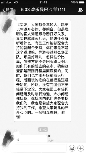 之后的行程尽管没太多偏差,但是旅行团成员们都感觉导游不太友好,景点的游览也是走马观花。另一方面,因为感觉酒店品质一般,第三天大家找到领队表达了不满。