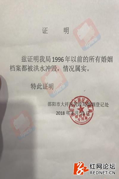 “大祥区婚姻登记处只能证明1996年之前的档案都被洪水冲毁,那我又要如何证明自己确实在这里结过婚呢?”拿着这份证明,法院自然是不予立案,欧阳先生觉得婚姻登记处出具的这份证明有些“奇葩”。“我还有孩子的出生证明,为什么他们就不能一起核查一下呢?”5月9日,他以网名“笑傲江湖踏雪”在红网论坛发帖吐槽自己的“尴尬”遭遇,引起了网友的热切关注。