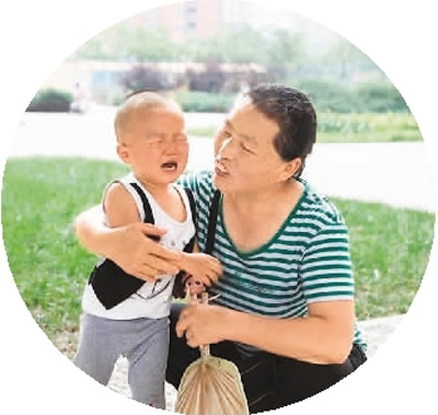 北京某社区内一位随迁老人正在安慰两岁多的孙子,孩子因为摔倒啼哭不止。