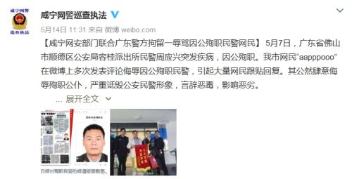 中新网5月15日电 据湖北咸宁网警巡查执法官方微博消息,咸宁网安部门日前联合广东警方拘留一辱骂因公殉职民警的网民。