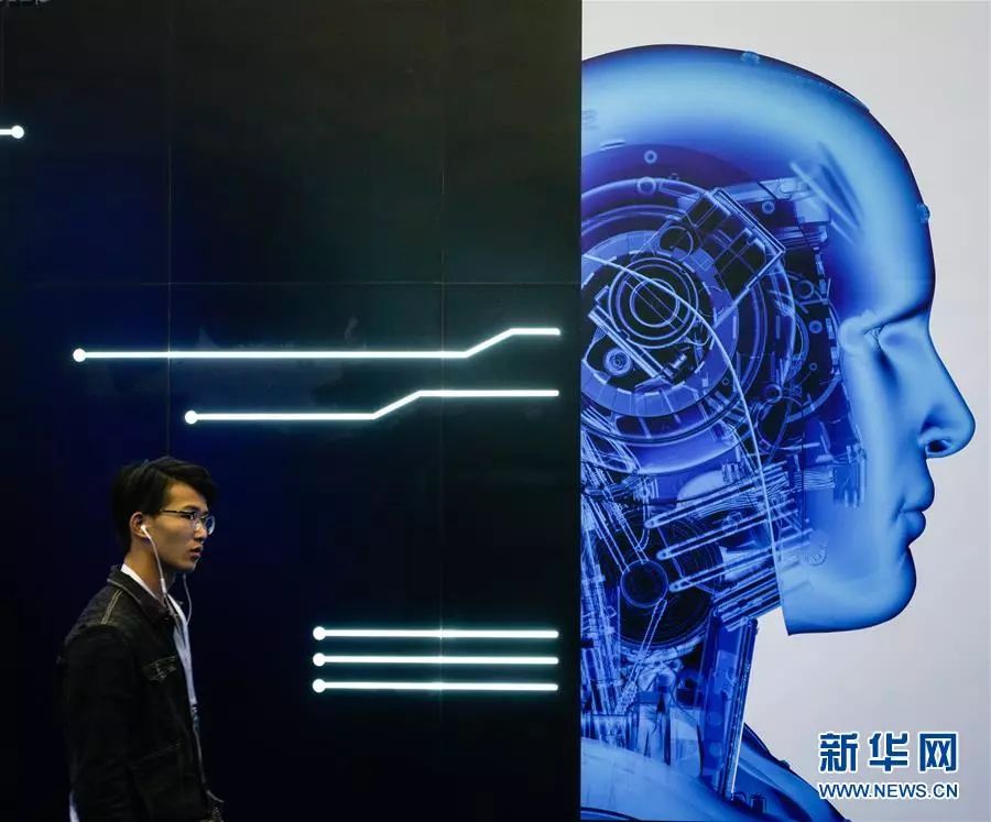 2018年5月10日,2018全球人工智能产品应用博览会在江苏省苏州市开幕。参观者走过博览会上人工智能主题的海报。新华社记者 李响 摄