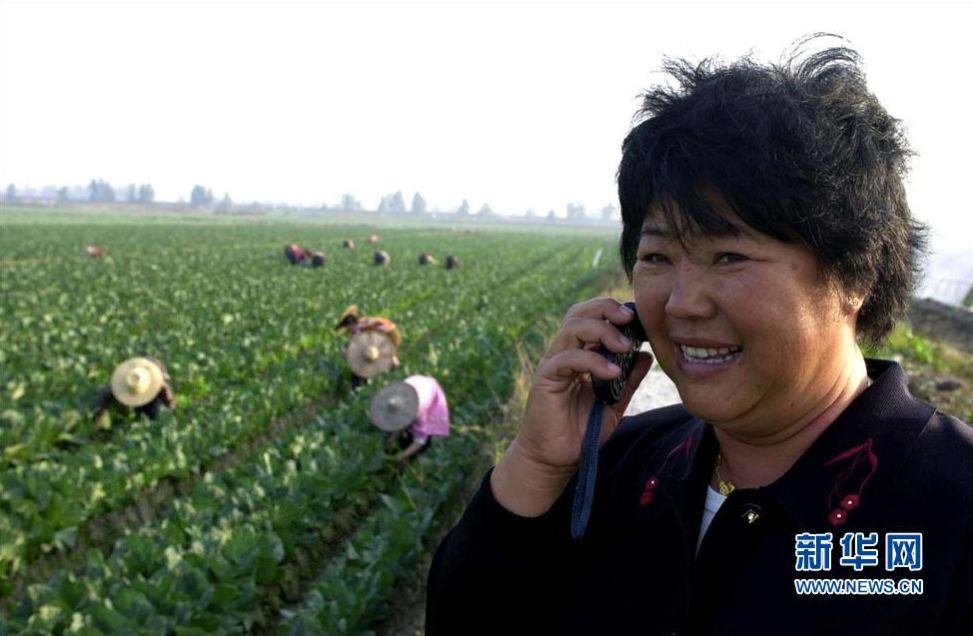 福建省莆田市涵江区农家女林水英在蔬菜生产基地用手机与国外客户交流市场信息(2002年摄)。新华社记者 张生贵 摄