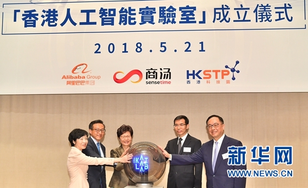 5月21日,香港特区行政长官林郑月娥(中)与嘉宾在成立仪式上。当日,为促进香港在人工智能方面的发展,阿里巴巴集团、商汤集团及香港科技园公司宣布成立“香港人工智能实验室”。 新华社记者 吕小炜 摄