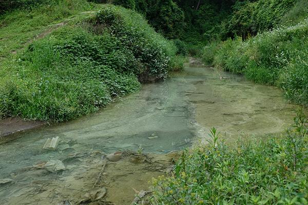老卜茨小溪未经处理的高锰溪水与已处理过的老卜茨井水汇流后从这里汇入松桃河