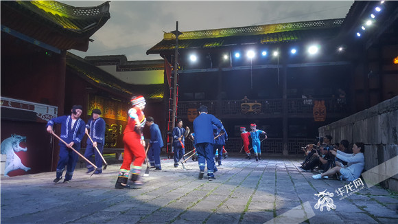 在厚重古朴的西秦会馆内,苗巫祭祀赤脚踩在烧红的铁铧上,徒手攀过层叠的刀锋间,让见多识广的记者们还是禁不住捏起一把汗。而当身着传统苗族服饰的美女帅哥唱起浪漫的情歌,跳起热情的摆手舞时,观演的记者席上掌声和叫好声顿时不绝于耳。