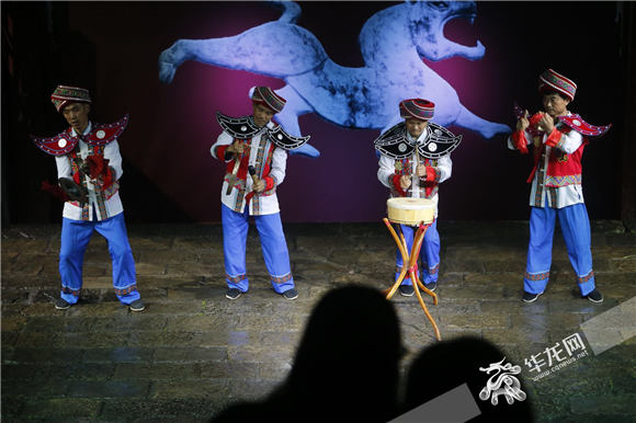 四位苗族演员表演《梯玛古歌》节目“耍锣鼓”。记者 李文科 摄