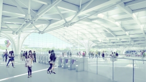 据悉,该站设计方案“梦开始的地方”是通过国际征集而来,由北京市政工程设计研究总院、法国AREP和北京弘都院组成的联合体提供。方案以“梦幻”为主题,融入了中国水墨山水画、科幻未来的元素。方案采用地景式建筑理念,把地铁建筑完全融入环境当中,为游客营造与主题公园一致的体验感。站厅与室外处于同一平面,游客走出站厅,就能来到南北两侧的公园下沉广场,平层进出,无感过渡。地铁站实行4个进站面分散客流,共布置400多个闸机入口,再结合两条地铁线提供的运力,就可应对每小时4万人的瞬时大客流,是普通地铁站的3倍。