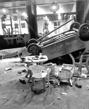 该段场面惊险的监控视频显示,夜晚的路边,一家饭店门前,有不少人正在吃夜宵。突然,一辆白色轿车从画面右上方出现。该白色轿车在高速行驶中先是来了个180度甩头,而后失去控制,漂移着撞入路边吃夜宵的人群中。现场顿时腾起很大的烟尘,笼罩了监控摄像头的大部分视野。其间有人见势不妙惊慌地离座逃生,有人则不幸被漂移的轿车撞倒在地。现场的桌椅、餐具等散落满地,一片狼藉。而漂移的白色轿车撞到饭店的台阶后,底朝天翻倒在地。