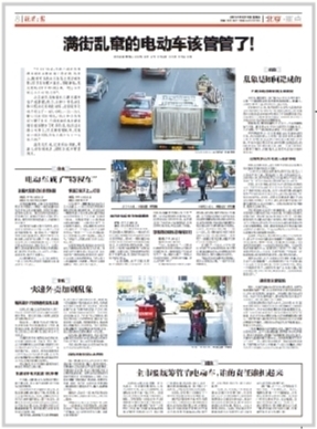 本报长期关注电动车乱象,图为2016年11月17日整版报道,提出了7成多电动车不合规、大多数从外地进京、认定难、处罚难等问题。