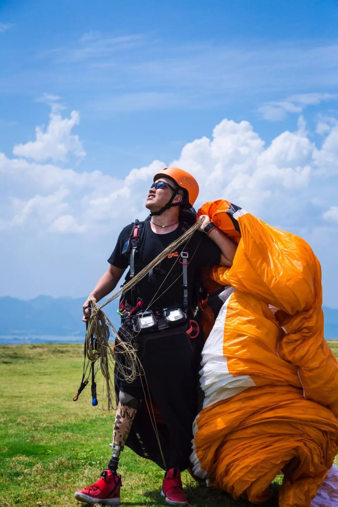 独立完成一次滑翔伞首飞,对普通人来说都不简单,更不要说,对周鑫涛来说了,“一般运动两个小时左右,义肢和皮肤接触的地方就会磨得生疼。地面控伞练习的时候,义肢会和皮肤摩擦,义肢硅胶套又比较闷,里面经常会有汗液堆积,所以得时不时脱了清理一下重新穿。”