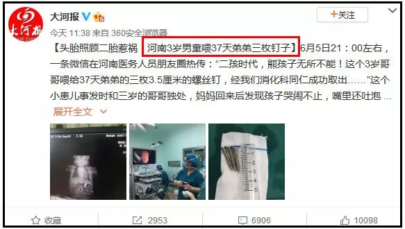 “杀手”无处不在,危险此起彼伏…二孩时代,熊孩子无所不能!这个3岁哥哥喂给37天弟弟的三枚3.5厘米的螺丝钉,经我们消化科同仁成功取出…