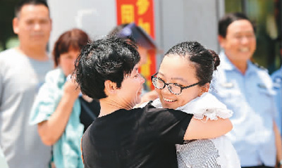 图为6月7日,在河南省宝丰县第一高级中学考点,考生走出考场后与家长拥抱。