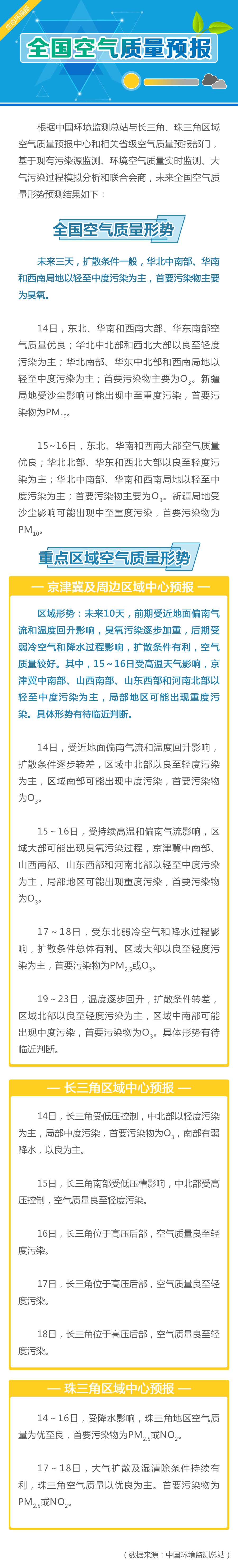 中新网6月13日电 生态环境部官方微博今日发布全国空气质量预报,未来三天(6月14-16日),扩散条件一般,华北中南部、华南和西南局地以轻至中度污染为主,首要污染物主要为臭氧。