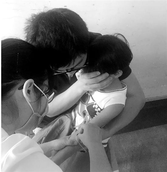 7岁女儿乖乖坐在爸爸腿上,护士给她抽血配对。她可能成为救治妈妈的希望。