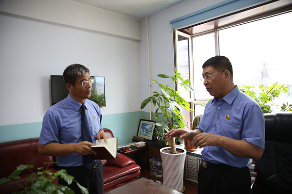 郭恩慧(左)和检察长刘伟华在办公室交流检察业务。