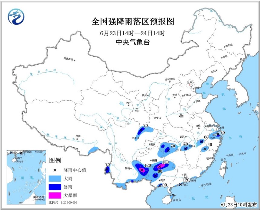据中央气象台网站消息,6月23日10时中央气象台继续发布暴雨蓝色预警:预计23日14时至24日14时,广西北部和南部沿海、广东南部沿海、云南东部和西北部、四川盆地北部、重庆东南部、贵州南部和东北部、湖南北部、江西北部、浙江北部、福建西北部等地的部分地区有大雨或暴雨,局地大暴雨(100~130毫米);上述部分地区伴有短时强降水(最大小时降水量20~50毫米,局地60毫米以上)。