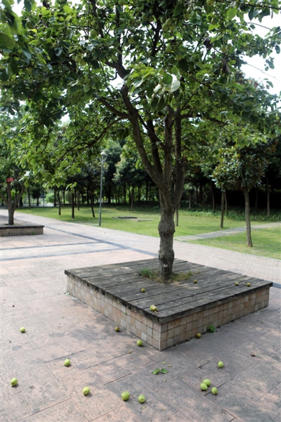 “有些是自然原因掉落的,有的就是人为的了。”据附近治安岗亭执勤的几名公园保安以及文明劝导员介绍,部分游客在路过时会伸手采摘,“这里的树没施化肥,也没打农药,肯定天然些,所以有些游客会摘来尝一尝,但发现不好吃就直接扔在地上了。”