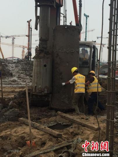 资料图:施工人员在北京新机场航站楼综合服务楼与停车楼工地打桩。 北京新机场建设指挥部供图