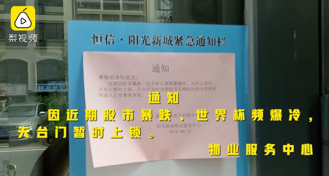 近日,山东潍坊,物业在小区张贴《通知》:近期因股市暴跌,世界杯比赛频繁爆冷,为防止发生意外,天台口暂时上锁。