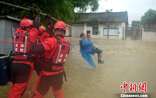 西来镇双流村消防官兵正在营救被洪水围困的村民。 刘忠俊 摄