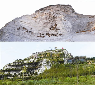 拼版照片:上图为椅子山采石场进行综合治理前的场景(资料图片);下图为2018年7月1日拍摄的椅子山(新华社记者牟宇摄)。