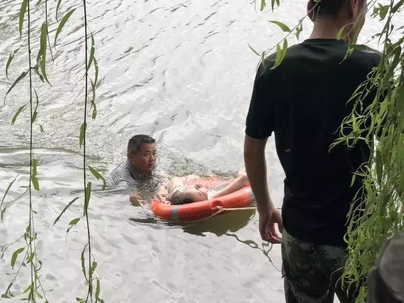 这时候人群中,一名男子快速的脱去衣裤和鞋子,跳到河里,奋力游到落水女子身边,拽住落水女子,将女子托起。