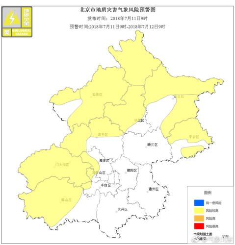 中新网7月11日电 据北京市气象局官方微博消息,北京市规划国土委和市气象局11日9时联合发布地质灾害气象风险黄色预警。未来24小时,北京市房山、门头沟、海淀、丰台、石景山、昌平、怀柔、密云、延庆、平谷等山区发生泥石流、崩塌、滑坡等地质灾害的风险较高,请注意防范。