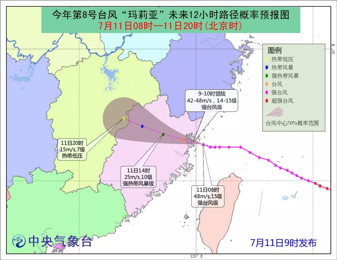 中央气象台上午发布消息,今年第8号台风“玛莉亚”(强台风级)的中心已于今天上午9点10分前后在福建省连江县黄岐半岛沿海登陆,登陆时中心附近最大风力有14级(42米/秒),中心最低气压为960百帕。