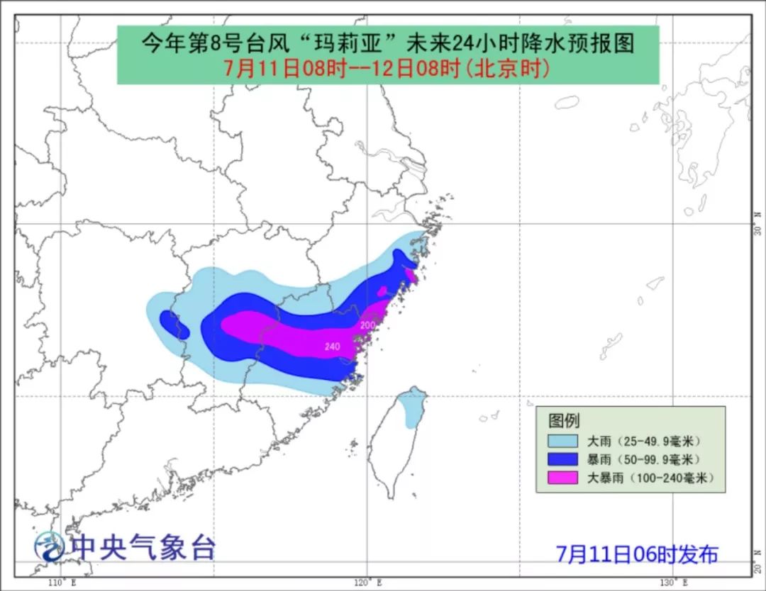 至11日20时,台湾岛中北部、浙江南部、福建中北部、江西东部等地将有大雨或暴雨,其中,台湾岛北部、福建中北部、浙江东南部等地的部分地区有大暴雨,浙江东南部、福建东北部、台湾岛北部局地有特大暴雨(250-350毫米)。