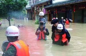 11日,强降雨致甘肃文县县城低洼地区遭水淹。图为救援人员疏散居民。新华社发