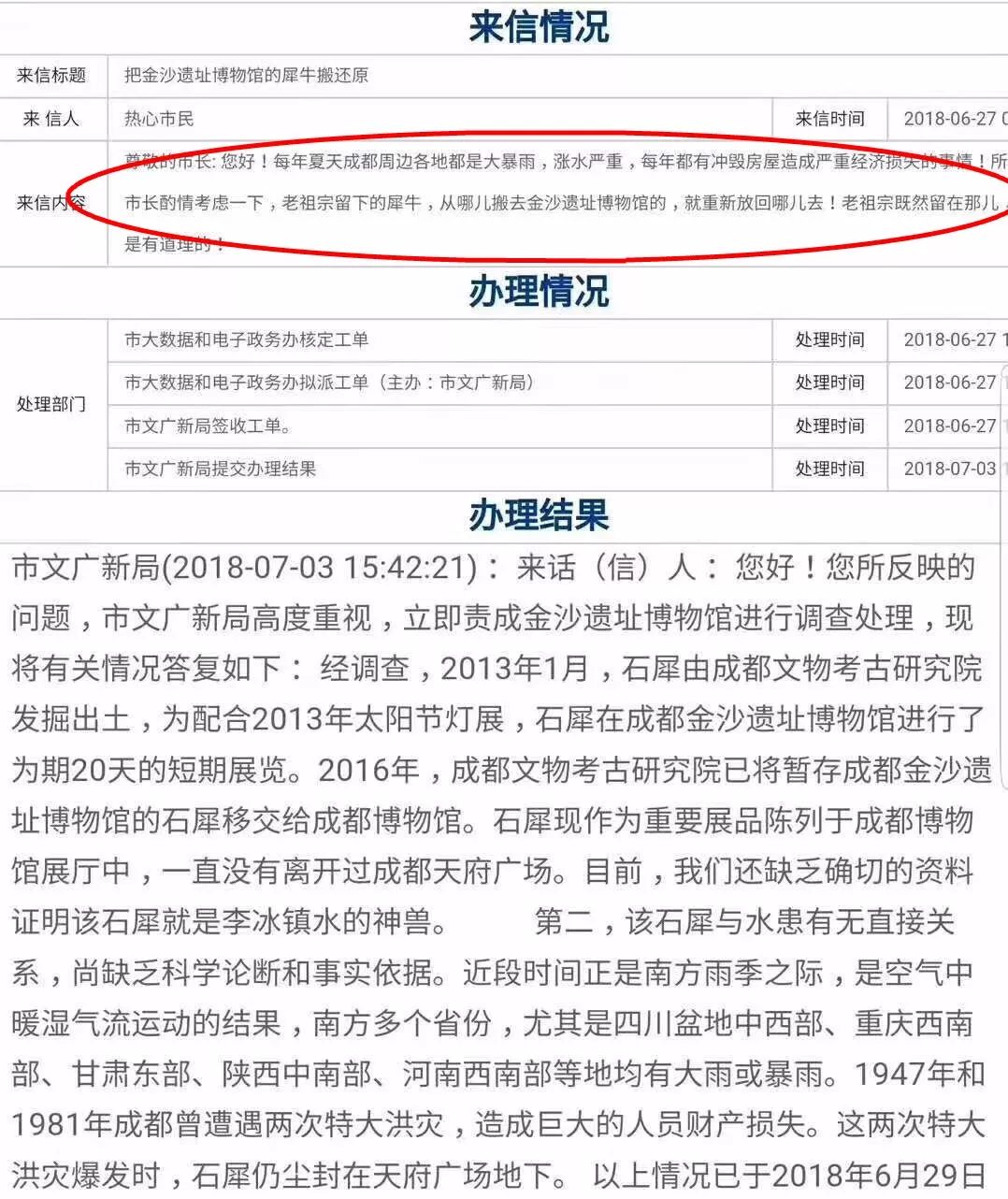 11日,成都市文广新局相关负责人表示,网上盛传的关于石犀的来信办理截图属实,系该局通过成都市人民政府门户网站回复的网友来信。
