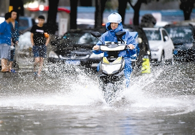 7月16日,一名快餐配送员从北京西城区一段积水的路面骑过。
