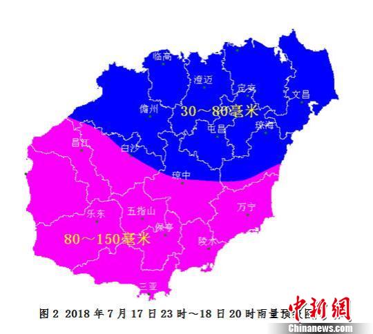 预计,17日23时~18日20时过程雨量:万宁、陵水、三亚、保亭、五指山、乐东、东方、昌江、琼中和白沙等市县80~150毫米,局地可达200毫米以上,其余市县30~80毫米。