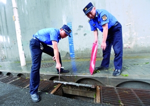 朝阳区来广营城管执法队开展24小时巡查执法行动。在辖区易积水路段,城管队员及时清理杂物,避免堵塞下水道。北京晨报记者 邹乐/文 首席摄影记者 吴宁/摄